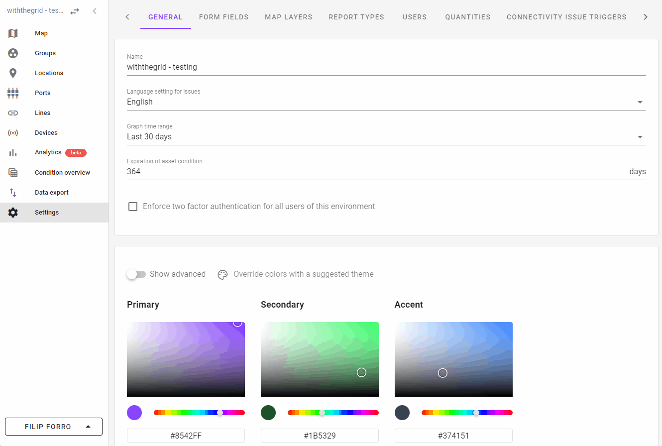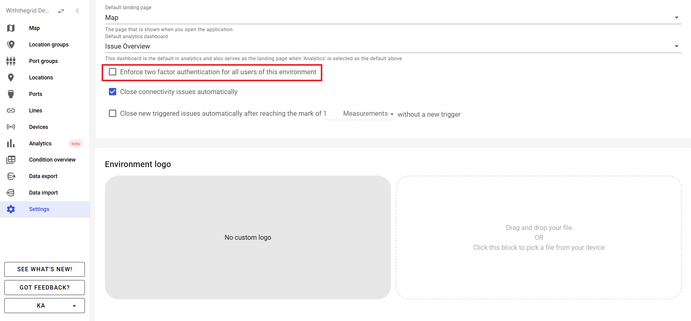 You can insert your own company or organization’s logo at the top left corner of the application. You can do this in the general settings menu scrolling down to ‘Environment logo’. Here, you can add a .png, .jpg, or .jpeg file by either picking a logo from your device or dragging and dropping one. The maximum size that won’t be resized is 187.33 x 64. The logo is now visible on the top left corner. The same applies to the connectivity environment.