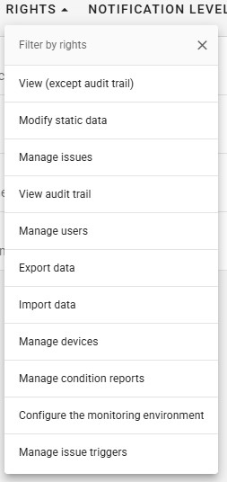 In this overview users can be added. For each user different rights can be assigned. The following users rights are distinguished: