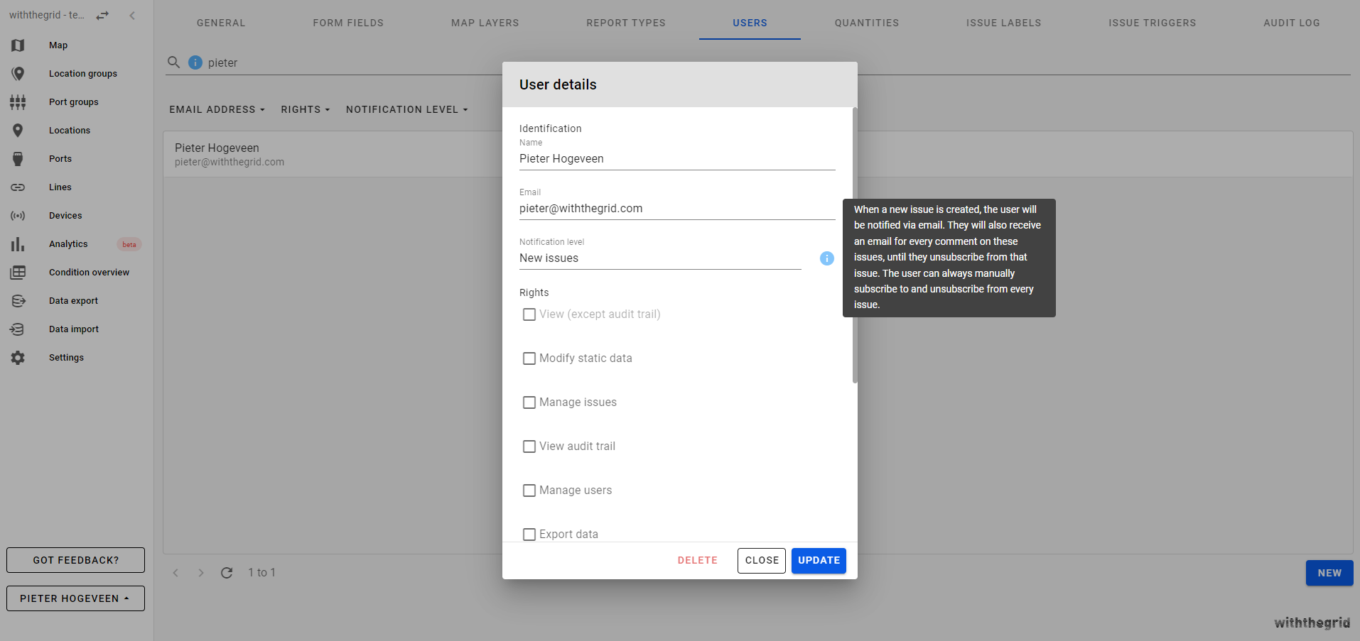 In this overview users can be added. For each user different rights can be assigned. The following users rights are distinguished: