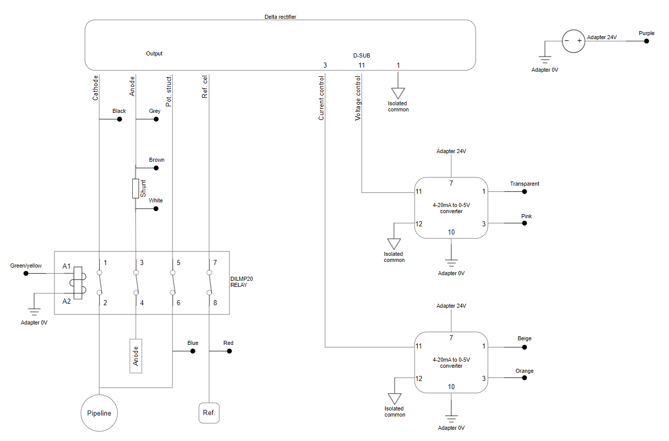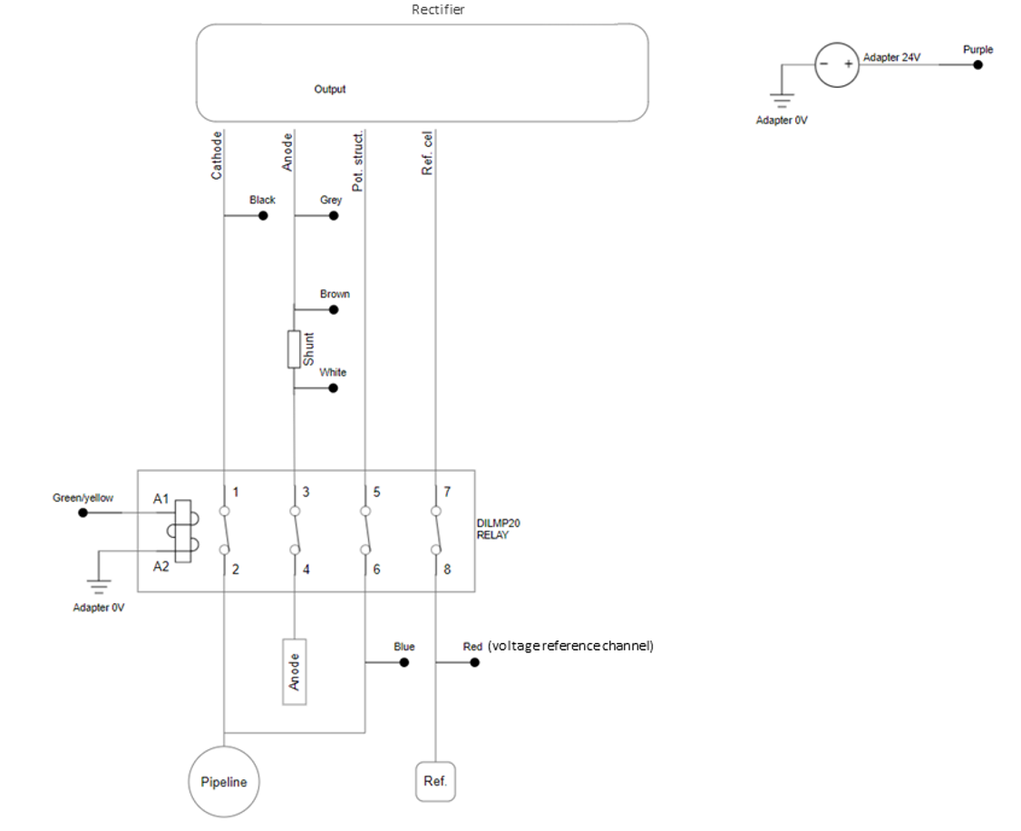 To perform the commands the cp rectifier analog device is capable of performing, such as switching and turning cathodic protection off, a relay needs to be positioned between the rectifier and the grid. This relay is controlled by the remote monitoring device.