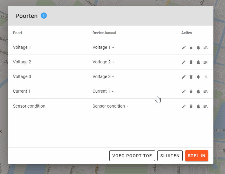 To connect a cp-pole port to the right cp-analog-rectifier device, select the location of the cp-pole device, click on ‘Ports’ in the left panel, press ‘edit’ on the voltage or current port, and fill in the name of the connected cp-analog-rectifier location in the ‘Link to rectifier location’ form-field.